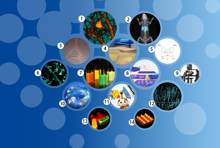2024.12.09トップページに掲載されている、14個の写真は「量子化学・量子技術の今」を表しています。